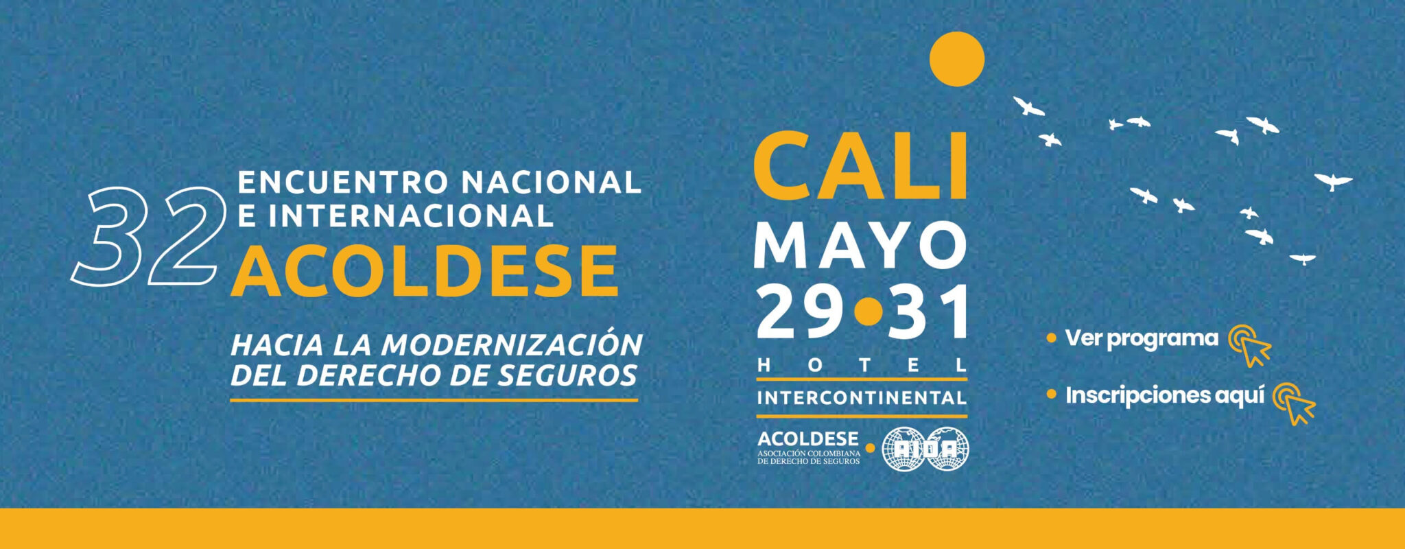 La Asociación Colombiana de Derecho de Seguros (ACOLDESE) celebrará su 32º Encuentro Nacional e Internacional denominado «Hacia la Modernización del Derecho de Seguros», durante los días 29, 30 y 31 de mayo de 2024 en el Hotel Intercontinental de la ciudad de Santiago de Cali, Valle del Cauca