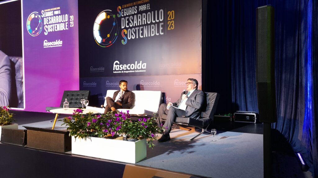 El segundo momento estuvo a cargo de Sebastián Carranza, director de Cambio Climático y Gestión del Riesgo del Ministerio de Ambiente y Desarrollo Sostenible; y Gustavo Morales, presidente Ejecutivo de Fasecolda; quienes conversaron sobre cómo fortalecer la actividad sostenible en la industria aseguradora y su aporte en la acción climática.