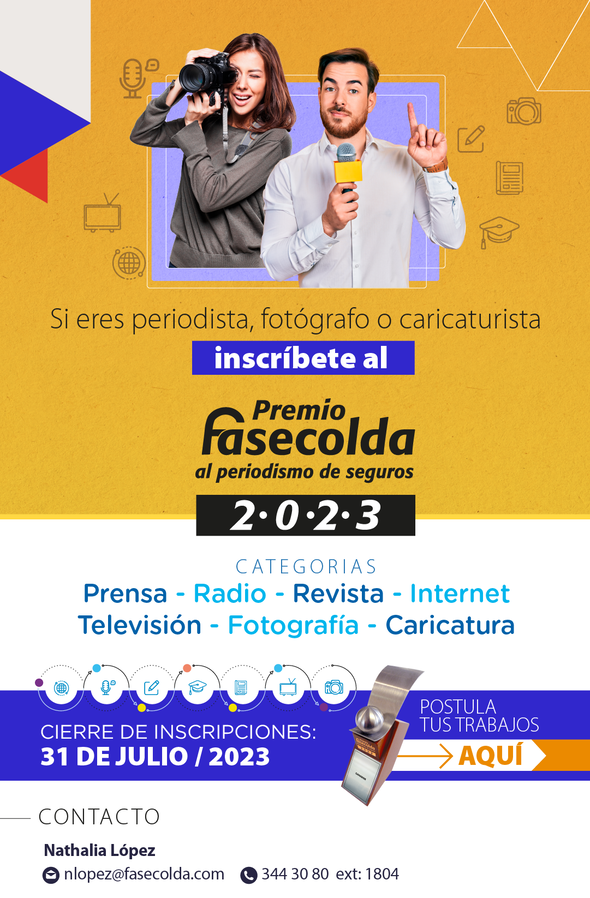 El próximo lunes 31 de julio se cierran las inscripciones para participar en el Premio Fasecolda al Periodismo de Seguros 2020, en las categorías periodísticas (Prensa, Revista, Radio, Televisión, Internet, Caricatura y Fotografía).